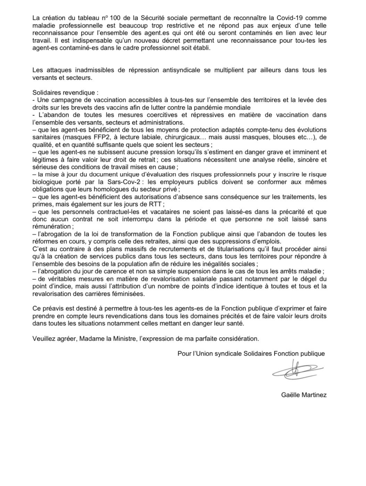 – L’abandon de toutes les mesures coercitives et répressives en matière de vaccination dans l’ensemble des versants, secteurs et administrations.